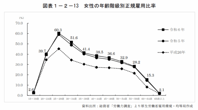その一方で、正規雇用比率は「25~29歳」の60.3%をピークに、「30~34歳」(51.6%)、「35~39歳」(41.4%)、「40~44歳」(38.5%)と、右肩下がりとなる傾向が続いている。このことから企業には、育児・家庭と仕事の両立を支援するなどの対策をさらに講じる必要があるとした。