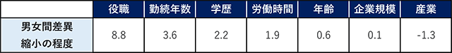 「男女間差異の縮小の程度」は、男女の条件を同じにした場合に、賃金差異がどの程度縮まるかを示した数値で、例えば今回のケースでは、男女が同じ「役職」に就いた場合に、賃金差異が8.8縮まることを意味する。