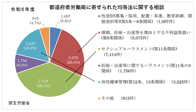 2023年度に都道府県労働局へ寄せられた男女の均等取扱いに関する相談では、「セクシュアルハラスメント」に関する内容が7414件(38.1%)で最多となり、「婚姻、妊娠・出産等を理由とする不利益取扱い」が5075件(26.0%)、「母性健康管理」3225件(16.6%)が続いた。労働局では差別的な取扱いを行った企業に対し、是正指導を行っている。