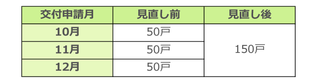 販売事業者による新築分譲住宅の申請数については、住宅購入者が決定する前に申請可能であることを理由に、月ごと・事業者ごとに上限戸数を設けていたが、同事業の執行進捗を踏まえて、10月以降の上限戸数を12月までの上限の合計数とする。例えば、上限戸数が50戸である場合、3カ月の合計数に当たる150戸が上限となる。