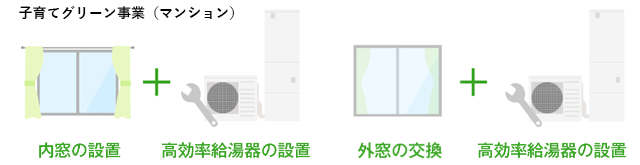 例えば、「開口部の断熱改修」を「内窓設置」とする方法では、専有部の①開口部の断熱改修(内窓の設置)、②エコ住宅設備の設置(高効率給湯器の設置)―の工事を行うことで、居住者単独での発注が可能となる。申請時には①、②を事業者に発注する。