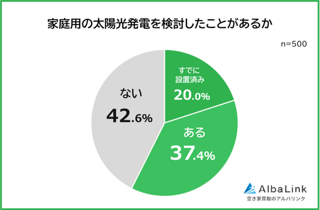 不動産関連事業を手がけるAlbaLink(東京都江東区)はこのほど、戸建て住宅に住む男女500人を対象に実施した「家庭用の太陽光発電に関する意識調査」の結果を発表した。調査によると、太陽光発電の設置を「検討したことがある」と回答した人は57.4%と、6割近くにのぼった。一方で、そのうち実際に設置した人は20%にとどまり、検討したものの導入には至らなかったケースが多いことが明らかになった。