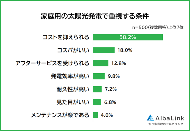 家庭用太陽光発電で重視する条件として最も多かったのは「コストを抑えられること」(58.2%)で、次いで「コストパフォーマンスが良い」(18.0%)が続いた。これは、導入を検討しない理由と表裏一体の結果となった。また、「アフターサービスが受けられる」(12.8%)、「発電効率が高い」(9.8%)、「耐久性が高い」(7.2%)といった回答からは、導入後の安心感を重視する傾向が見て取れ、経済的かつ安心して長く使える太陽光発電システムが求められていることがわかる。