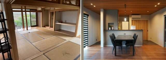 内観のBefore(左)After(右)。和室と縁側をダイニングキッチンに