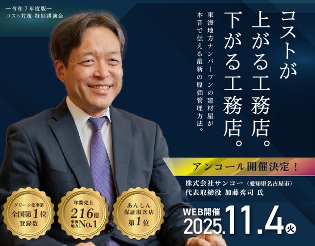 ラスト・コンパス(大阪市)は、オンライン特別講演会『コストが「上がる工務店」と「下がる工務店」』を、11月4日(LIVE講演)、12日・20日(アーカイブ配信)に開催する。5月に実施した同講演会が好評だったことを受け、アンコール開催が決定した。講師は、建材商社サンコー(名古屋市)代表取締役の加藤秀司さん。