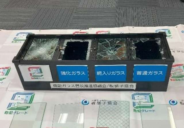 記者発表後には、4種類のガラス(防災防犯グレードの合わせガラス、強化ガラス、網入りガラス、普通ガラス)を用いた破壊実演が行われ、防災防犯グレードの合わせガラスがこじ破りや打ち破りに対して高い耐性を持つことが示された。