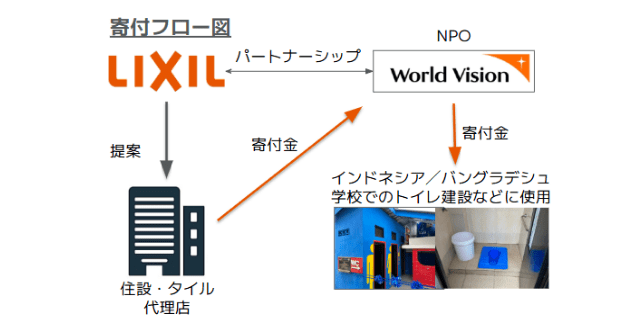 寄付金はワールド・ビジョン・ジャパンを通じて、多くの人が衛生的なトイレのない生活をおくるインドネシア・バングラデシュの学校のトイレ建設および改修、SATOの製品費用などに使用される。また、手洗いや月経管理に関わる啓発活動を行い、衛生行動の改善を促進する。