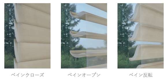 従来のシェードにはない「ベイン反転構造」を搭載。ベイン(羽根、スラット)を反転させることで、直射日光をやわらかく拡散して室内に心地よい自然光を取り込む。