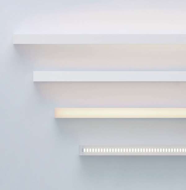 4種類の配光タイプを同一形状・同一サイズで展開しており、異なる配光タイプが同一空間に存在しても統一感を持たせることができる。長さは約600・約900・約1200・約1500 mmの4種類で、設置場所に合わせた組み合わせが可能。単体設置で間接照明として導入することもできる。
