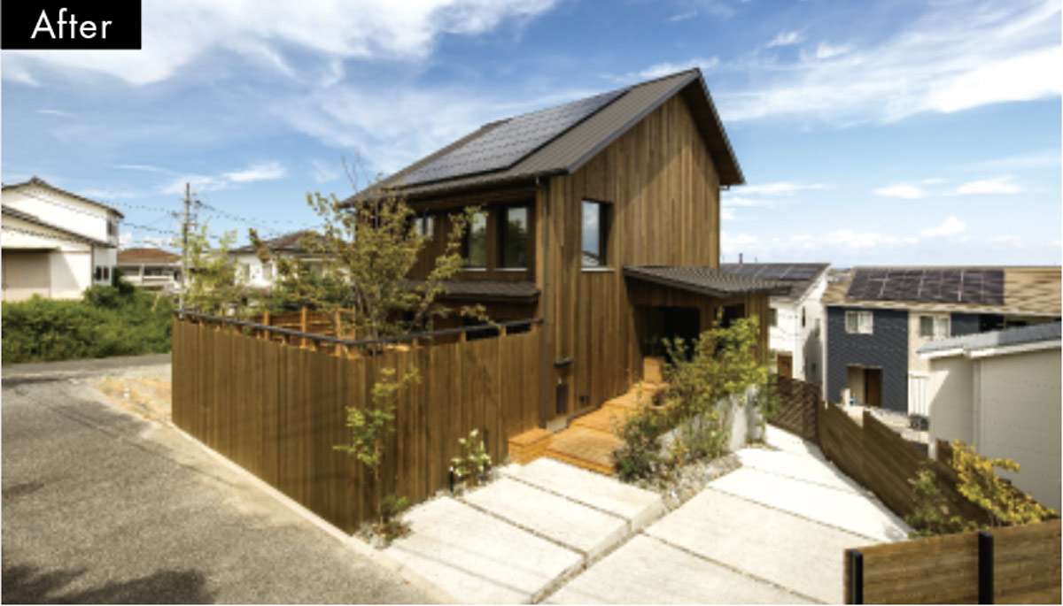 | パッシブハウスの認定取得を目指す、フルリノベーションした野澤邸。外壁は無垢のスギ板張り(ウッドロングエコ仕上げ)で、ウッドデッキも半分に割った同じスギ板を連続させるようにして囲んでいる | |