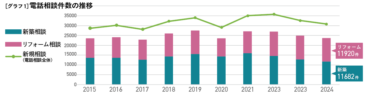 電話相談の件数は減少傾向にあり、全体では2年連続で減少。新築・リフォームのいずれも減少しているが、リフォームは新築に比べ減少幅が小さく、リフォームの需要とそれに伴うトラブルの増加がうかがえる。