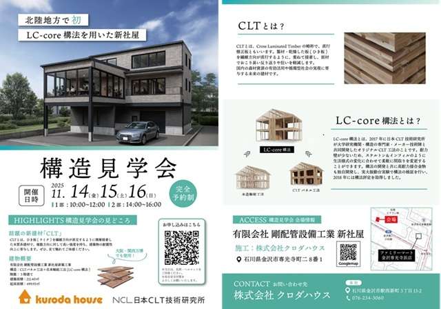 ライフデザイン・カバヤ(岡山県岡山市)が運営するCLTフランチャイズネットワーク本部「日本CLT技術研究所」(岡山市)は、オリジナルCLTパネル工法「LC-core構法」の構造見学会を、11月14日~16日の3日間、石川県金沢市で開催する。加盟企業であるクロダハウス(石川県金沢市)が手掛ける物件で、北陸地方での構造見学会は今回が初となる。参加費無料、完全予約制。