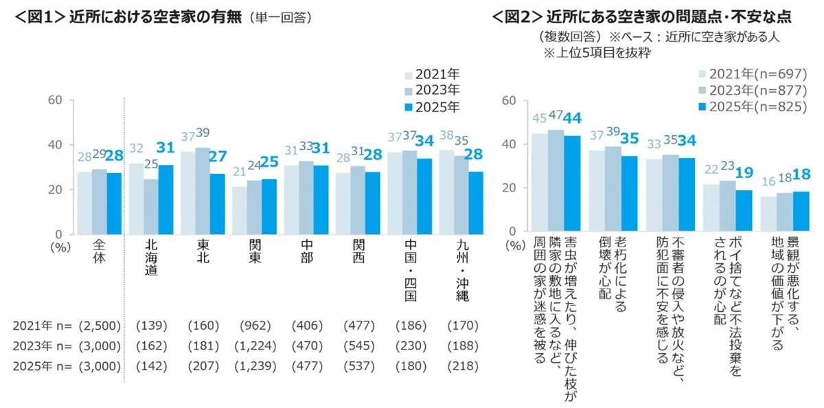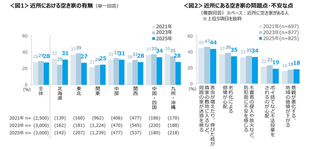 調査では、「自宅近くに空き家がある」と回答した人は28%にのぼり、中国・四国(34%)、北海道と中部(ともに31%)で特に多かった。