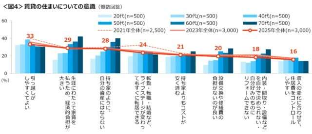 しかし、「生涯にわたって家賃を払うため、経済的負担が大きい」(29%)、「自分の資産にならない」「リフォームできない」といったネガティブな意見も多く、特に年代が上がるほどその傾向が強まっている<図4※クリックで拡大>。