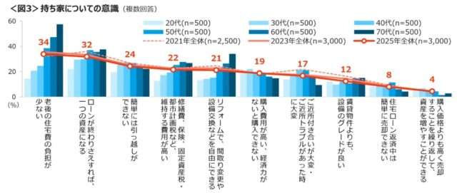 年代別では、60~70代の「老後の住宅費の負担が少ない」、70代の「リフォームで、間取り変更や設備交換などを自由にできる」といった項目が他年代よりも高く、年齢が上がるほど持ち家の自由度や経済的メリットを重視する傾向が見られた<図3※クリックで拡大>。