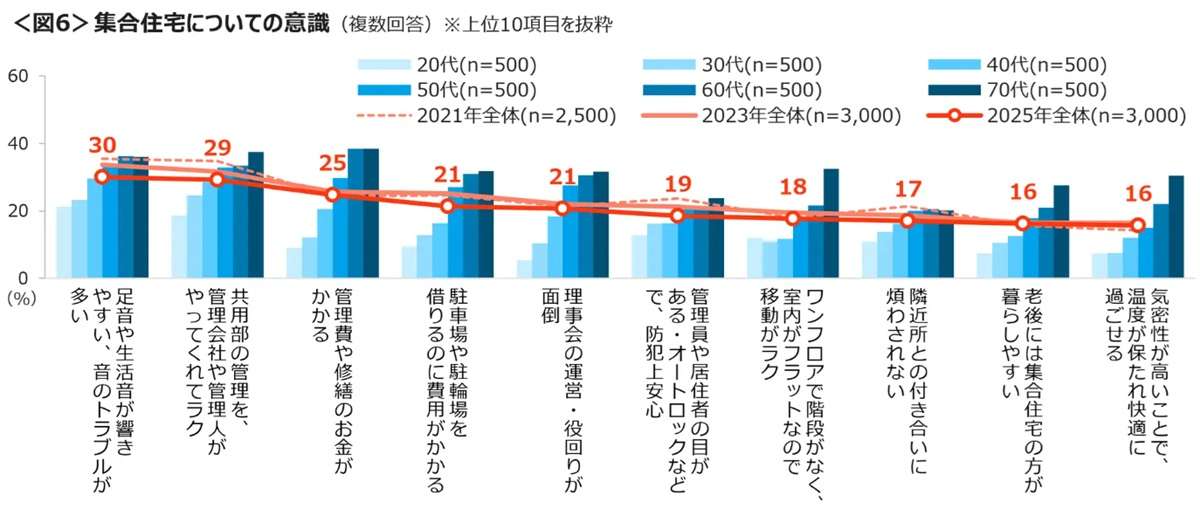 集合住宅に対しては、「足音や生活音が響きやすい、音のトラブルが多い」(30%)、「管理費や修繕のお金がかかる」(25%)など、ネガティブな印象が目立った。一方で、「共有部の管理を管理会社や管理人がやってくれてラク」(29%)といった利便性を評価する声もあった<図6※クリックで拡大>。