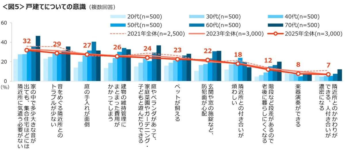 戸建て住宅と集合住宅にも年代差がみられた。戸建て住宅については、「多少大きな音が出ても、隣近所に気遣う必要がない」(32%)が最多で、70代では47%に達した。また、60代では「庭の手入れが面倒」(41%)という声が他年代よりも多かった<図5※クリックで拡大>。