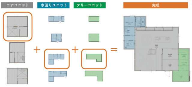 規格ユニットは、LDK空間など住まいの中心となる「コアユニット」と洗面・浴室・トイレなどの「水回りユニット」、書斎・収納・子ども部屋など多目的に活用できる「フリーユニット」の3つ。この規格ユニットを自由に組み合わせて設計することにより、敷地や家族構成、ライフスタイルなど多様な条件に柔軟に対応するプランニングが可能になる。「組み合わせは1000通り以上」という。