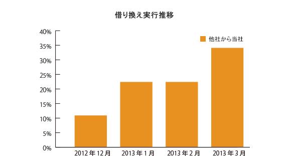 それによると、借り換え実行件数全体のなかで、他社から同社への借り換えが占める割合は、12年12月は11%だったのに対し、13年3月は34.2%まで増えていた。他社から借り換えた人を年代別にみると、30代と40代が全体の8割超(84.8%)を占めた。