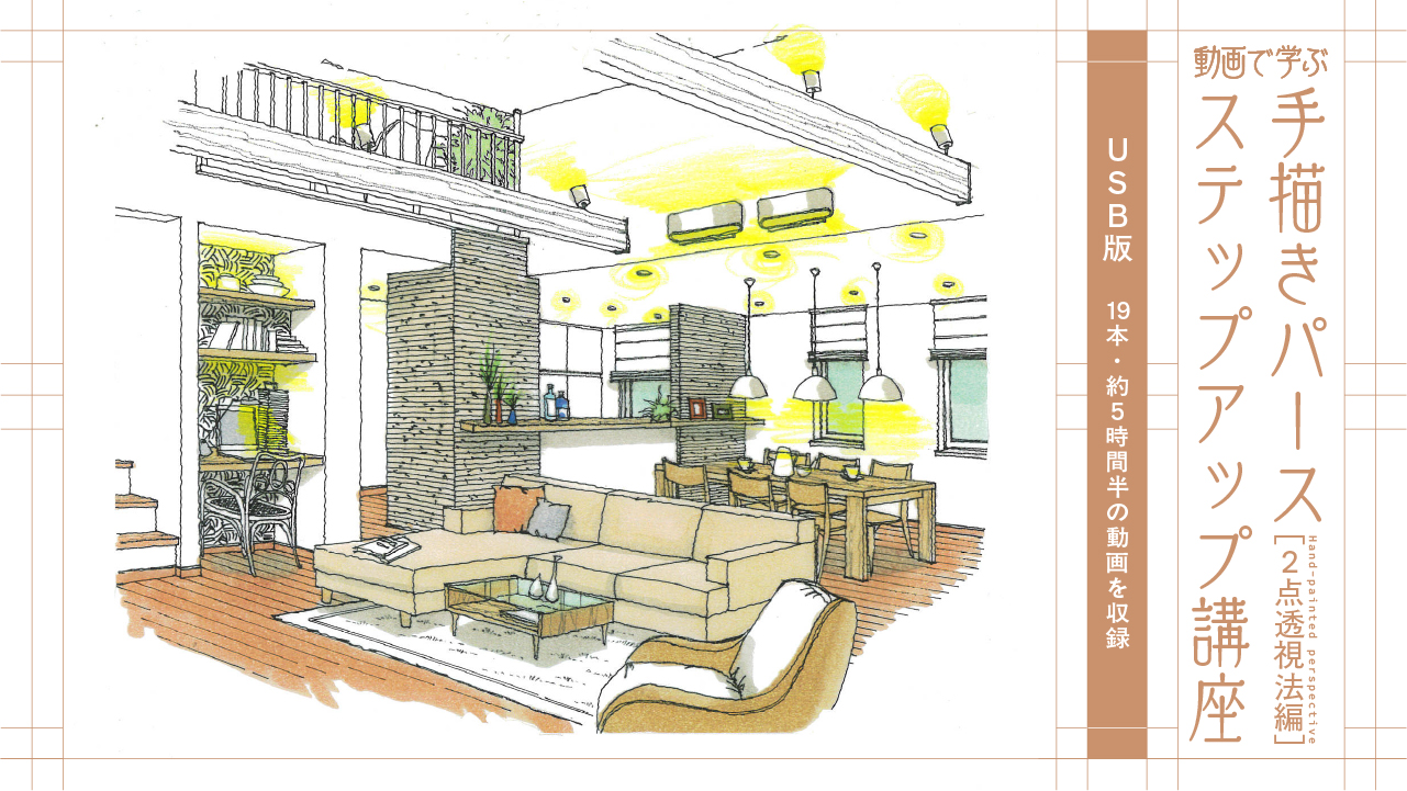 2点透視法による立体的で奥行きのある表現を身につけ、デザイン家具や素材、間接照明なども描けるようになる実践的な内容です。お客さまの前で魅力的なスケッチをササッと描ける力を、このUSB 版で身につけましょう。
