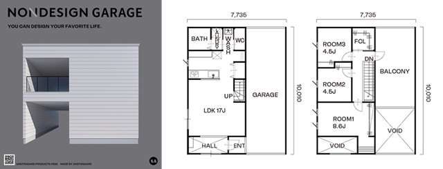 ライフスタイルの多様化に伴い、趣味や暮らしの延長としてのガレージ空間が注目されるなか、「NONDESIGN GARAGE」は、ノンデザインのシンプルなBOX型を生かしたガレージハウスとして登場。奥行き10mのガレージは2台駐車が可能で、「モノを置く場所」から「暮らしを楽しむ空間」へと進化させた。