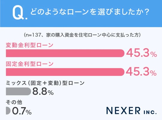 ローンの種類については、「変動金利型」と「固定金利型」がともに45.3%で同率首位。固定型と変動型を併用する『ミックス型』と回答した人も8.8%いた(下グラフ)。