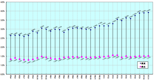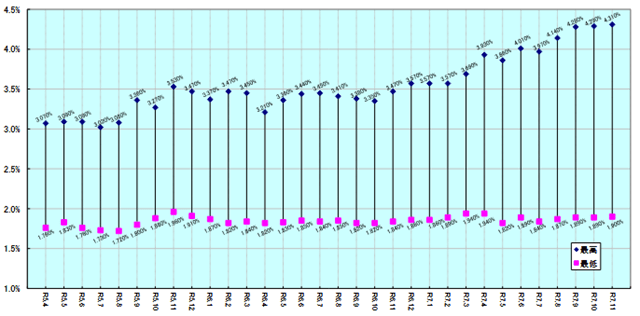 返済期間21年以上35年以下の最低金利は、融資率9割以下が1.90%、9割超が2.01%と、いずれも前月から0.01ポイント上がり、2カ月ぶりに上昇した。最高金利は、9割以下が4.31%、9割超が4.42%で、前月から0.02ポイント上昇した。