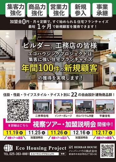 ハーバーハウス(新潟市)が運営する住宅フランチャイズ「エコハウジングプロジェクト」は、年間100件の新規顧客の獲得を実現できる「集客に強い」フランチャイズとして、現在、全国の工務店・ビルダーの加盟店を募集している。