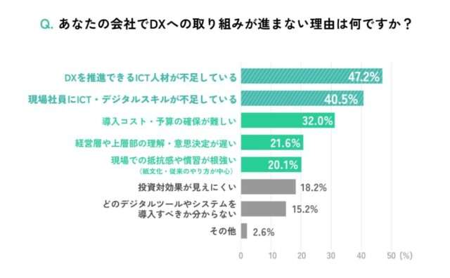 DXの遅れ、停滞が目立つのはBIM/CIM(43.5%)やクラウド施工管理(42.0%)といった基幹業務。DX停滞の要因としては、DXを推進する人材の不足(47.2%)、現場社員のICTスキル不足(40.5%)など人材に関する内容が多い。人材育成に困難を感じている企業は68.3%に上り、「教えられる人材がいない」(60.5%)、「研修時間が取れない」(53.2%)といった課題が浮上している。