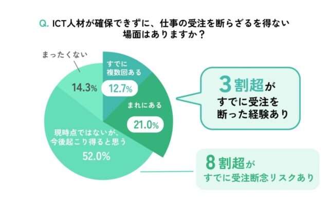 また、ICT人材不足により「受注を断った経験がある」企業は33.7%を占める。また52.0%も「今後起こり得る」と答えており、8割以上の企業が受注機会損失のリスクを抱えていることも浮き彫りとなった。