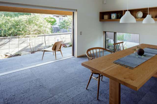 「豊かな休日を楽しむ平屋」のリビングダイニング。島石300×600×25㎜を全面に張っている。サッシを開くと同じく島石を張ったテラスとつながる