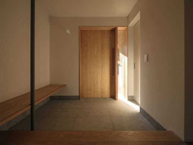 「向東の家」玄関を室内側から見る。300×600㎜の芦野石を突き付けで張っている。左のベンチ下は半端な寸法になっているが目立たない