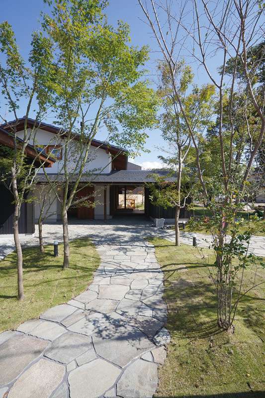 モデルハウス「響の杜」アプローチから外観を見る。建物に近づくほど小さな石を張り、視覚的に奥行きを強調している