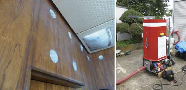 同会議が実用化に向け開発を進めているのは、内壁にΦ100㎜の穴をあけ、ブローイングマシンで断熱材(セルロースファイバー)を吹き込むという工法だ。吹き込みは同会議メンバーのハイシマ工業(さいたま市)が所有するドイツ・X-FLOC社製注入機を使用。断熱材を吹き込みながら壁内の空気を排出できるため、別途空気を抜くための穴あけが不要になった。