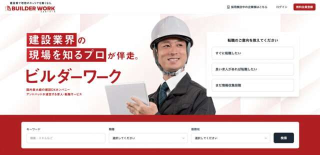 建設業特化型の採用支援サービスとして本格スタートした「ビルダーワーク」ウェブサイトのトップページ