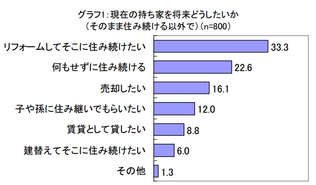 まず、現在の持ち家を将来どうしたいか聞いたところ、一番多かった回答は「リフォームしてそこに住み続けたい」33.3%。理由の上位は「当初よりだいぶ古くなったため」64.3%、「老後を考え、バリアフリーの家に住みたいため」24.4%、「今の家は耐震性に不安があるため」12%だった。