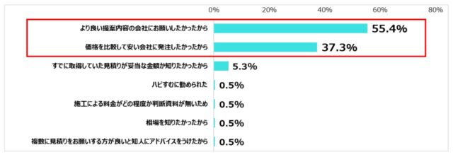 見積りは全体の9割以上が複数社から取得しており、「3社比較」が45.4%で最多、次いで「4社比較」が22.7%となった。相見積りの理由としては「より良い提案内容の会社にお願いしたかったから」が55.4%で最も多い。「価格を比較して安い会社に発注したかったから」は37.3%にとどまった。契約先に見積提示額が最安だった会社を選んだ会員は56.6%で、43.4%は最安値以外の会社を選択している。
