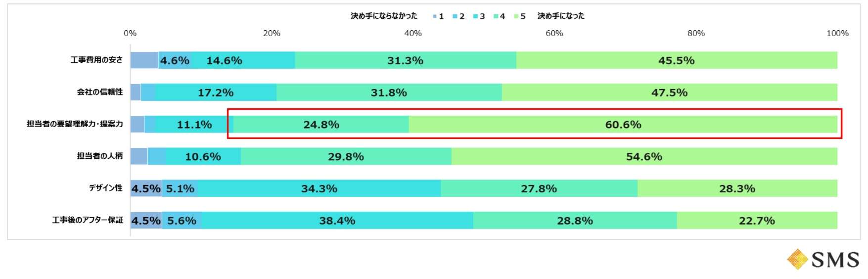 ハピすむリフォームは、調査結果について「物価高騰の影響により、屋根や外壁に比べ、比較的安価な水回りのリフォームが選ばれる傾向が示唆される」と分析している。一方でリフォーム会社の選定に関しては、「担当者の要望理解力・提案力」や「担当者の人柄」、「会社の信頼性」 が「工事費用の安さ」よりも上位となっていると指摘。「物価高であるからこそ、捻出した予算の使い道については慎重であり、信頼できる会社に依頼したいという意見が垣間見える」とした。
