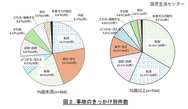 事故のきっかけは、75歳未満では「転落」と「刺す・切る」がそれぞれ82件(22.2%)、「転倒」が73件(19.8%)、75歳以上では「転倒」が185件(33.4%)、「転落」が129件(23.3%)となっている。具体的な事例では、「住宅内での転倒」(57件)、「階段で足を滑らせる(転落)」(68件)、「脚立から転落」(49件)などが多数報告されている。