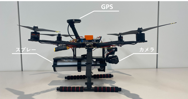 クマよけスプレーの一般的な噴射距離は約5~10mで、主成分のカプサイシンが人間の数千倍の嗅覚を持つクマの目・鼻などの粘膜に強い刺激を与えるため、突進や接近から退避する時間を確保することができる。同製品は、クマよけスプレー缶とFPVカメラを機体に搭載し、コントローラーで映像を確認しながらワンボタンで上空からの遠隔噴射が可能。GPS Position飛行により、屋外での安定運用を実現した。飛行時間は約10分。電波距離12km。