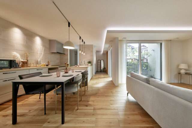そして生み出したのが、BELS★★★★★5ツ星、平均C値は0.2㎠/㎡を標準とした、2×4構造の住まいだ。構造計算、耐震・制震ダンパーで高耐震仕様に。高性能フィルターと全館換気システムも取り入れた。トリプルガラスの高性能樹脂サッシ、太陽光発電+HEMS搭載なども仕様に盛り込んだうえ、家事動線や内外装などの意匠面にも注力。