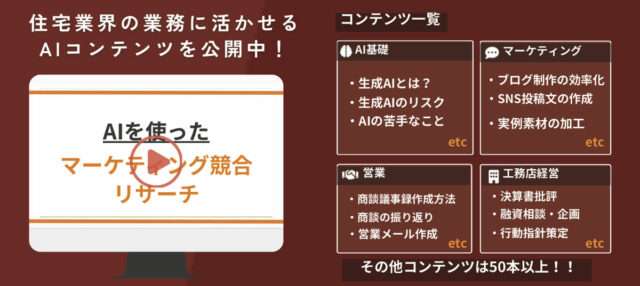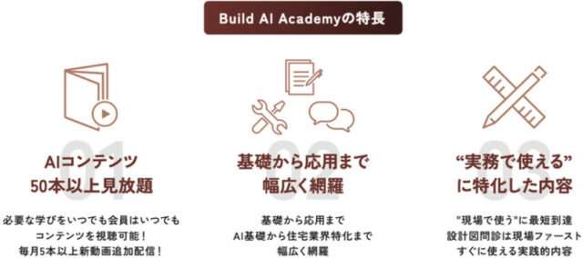 AIについて学ぼうとするとき、多くの教材は技術面に終始するなど専門的すぎて、実務に生かせるようになるまで、相当な時間と段階が必要になる。その点、「Build AI Academy」は住宅業界の実務に特化した内容なので、AIが集客や営業、設計などにどのように活用できるか具体的に把握できる。