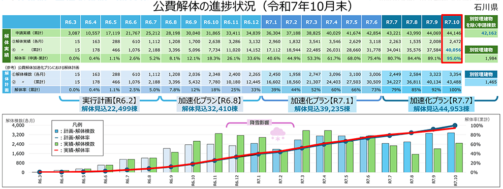 石川県は11月7日に開いた会見の中で、10月末時点の公費解体の進捗状況を報告した。申請棟数4万2162棟のうち4万56棟の解体が完了し、「公費解体加速化プラン」(PDF)で設定した解体完了目標の95%を達成。穴水町、宝達志水町、かほく市、能美市、小松市、加賀市の6市町では、すべての解体が完了している。残る2106棟の建物についても年内に完了する見込み。