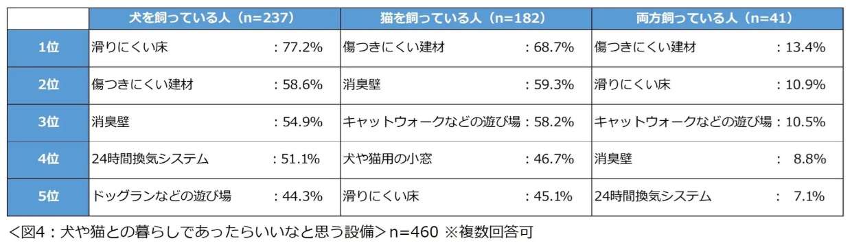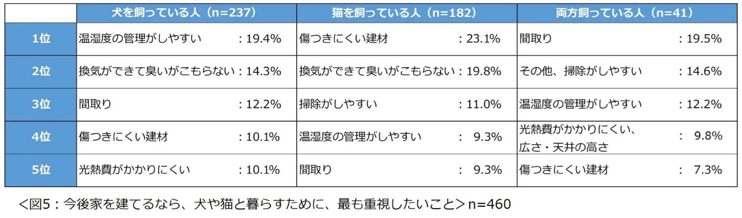 理想の住まいに求める設備としては、犬を飼っている人では「滑りにくい床」(77.2%)、猫を飼っている人では「傷つきにくい建材」(68.7%)がそれぞれ最多(複数回答)。今後家を建てる際に重視したい点としては、犬の飼い主は「温湿度の管理がしやすい」(19.4%)、猫の飼い主は「傷つきにくい建材」(23.1%)が1位に挙がっている。また犬、猫とも「換気ができて臭いがこもらない」が2位に挙がった。
