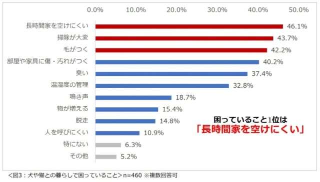 一方で、犬や猫と暮らす上で現在の住まいに「満足していない」と回答した人は26.3%と約3割に上り、ペットとの暮らしにおける住環境への不満が一定数存在することが分かった。困りごとの上位には「長時間家を空けにくい」(46.1%)、「掃除が大変」(43.7%)、「毛がつく」(42.2%)といった日常的な課題が挙げられている(複数回答)。