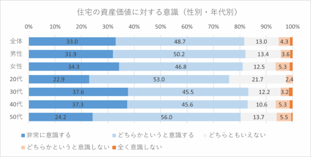 回答者のうち、資産価値を「非常に意識する」層は33.0%。「どちらかという重視する」が48.7%だった。年代別では、30代では37.6%が、40代は37.3%が「非常に意識する」と回答している。