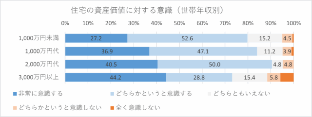また年収別でみても、年収が高い層ほど「非常に意識する」の割合が増加。年収1000万円未満では27.2%に対し1000万円台では36.9%、3000万円以上は44.2%に達しており、一次取得層で高収入層ほど住宅を「投資性のある資産」として重視する傾向が明確になった。