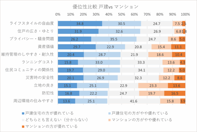 さらに、戸建てと並行してマンションを検討している層は、ハード・ソフトに関する11項目のすべてで、戸建てが優位と考えていることがわかった。特に戸建てが優位だった項目としては「ライフスタイルの自由度」(65.3%)、「住戸の広さ・ゆとり」(64.5%)、「プライバシー・騒音」(61.7%)。資産価値でも52.7%は戸建てが優位と答えている。資産価値に土地が占める割合が高い点や、管理費・駐車場代がかからない点などが評価され、生活面・資産面の双方の優位性が明確になった。