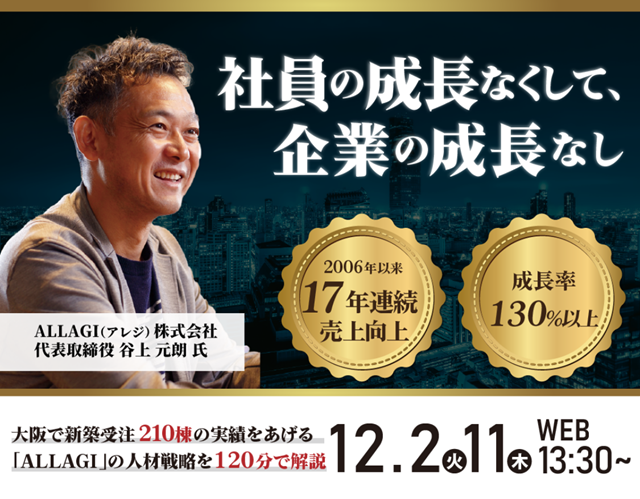 講師はALLAGI代表取締役の谷上元朗さん。社員の成長を企業の成長に結びつける経営の舞台裏を、人材戦略をテーマに解説する。社員数6人・売上6000万円の職人集団から、下請け脱却を経て社員数300人超・売上160億円に至るまで、どのような戦略で課題を克服し成長を遂げたのかを紹介する。