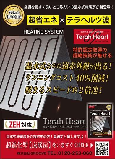 GROOVE(神奈川県横浜市)が販売するTerah Heart(テラハート)は、特許認定を取得した遠赤外線温水パネル床暖房システム。独自の並列循環方式により、床全体を均一に効率よく温めることができる。さらに、遠赤外線効果を活用することで、体の芯から温まる快適性も実現する。